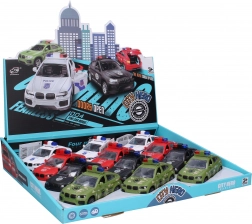 Dostupne su 4 dizajnerske varijante – vatrogasci, vojno, policija SWAT i bijeli policijski auto – idealno za kolekciju ili kao poklon. Model ima kompaktne dimenzije 13 × 6 × 6 cm i zahvaljujući inercijskom pogonu lako kreće naprijed nakon povlačenja.