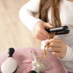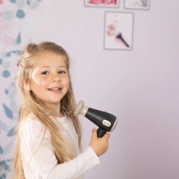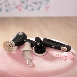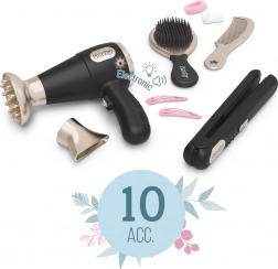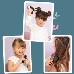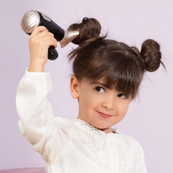 - Puno zabavnih mogućnosti – sve što početni frizer treba: sušilo, izmjenjivi nastavci za sušilo, pegla, četka, češalj, šnalice i gumice za kosu.