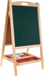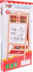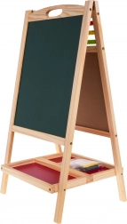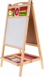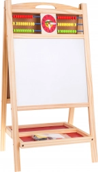 Drvena obostrana ploča s računaljkom izvrsna je obrazovna igračka za djecu od 3 godine. Ova multifunkcionalna ploča s jedne je strane bijela i magnetska, a s druge za pisanje kredom. Na bijelu stranu možete pisati flomasterom koji je dio pakiranja. Flomaster je magnetski i ima gumicu za brisanje. U gornjem dijelu ploče nalazi se računaljka i sat s pomičnim kazaljkama. Na stranu za kredu može se crtati priloženim kredama, a zatim sve obrisati spužvom.