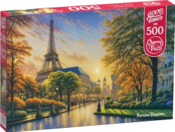 Puzzle prikazuje detalj Eiffelovog tornja u Parizu tijekom zlatnog zalaska sunca, što stvara romantičnu atmosferu.