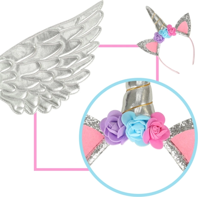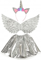 Ovaj prekrasan kostim omogućit će vam da pretvorite svoje dijete u jedinstvenog jednoroga. Sastoji se od srebrne suknje, elegantnih krila i detaljno izrađenog obruča s ružicama. Idealan za svaku priliku u kojoj dijete može uživati u bajkovitoj igri.