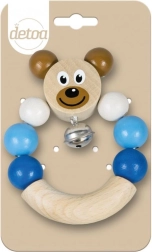 Drvena zvečkica s medvjedićem u plavoj boji. Lako se drži, zvončić nježno zvoni. Zvečkica je lagana i prikladna za djecu od 6 mjeseci. U EKO prirodnom pakiranju.