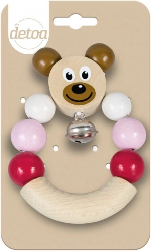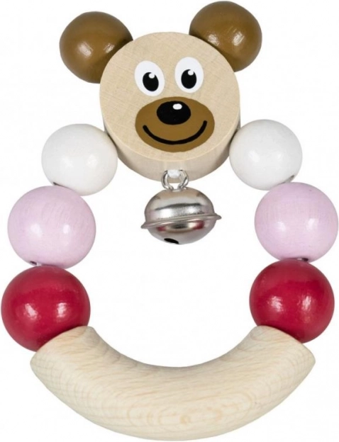 Drvena zvečkica s medvjedićem u ružičastoj boji. Lako za držanje, zvončić nježno zvoni. Zvečkica je lagana i pogodna za djecu od 6 mjeseci. U EKO prirodnom pakiranju.