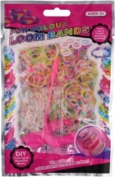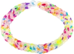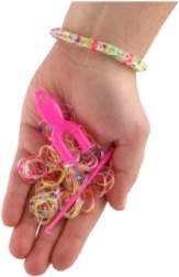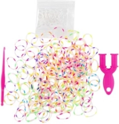Sadrži sve potrebno za izradu narukvica - 200 gumenih traka u boji duge, kukica i kopče.
