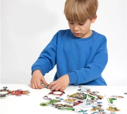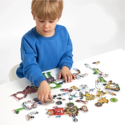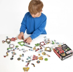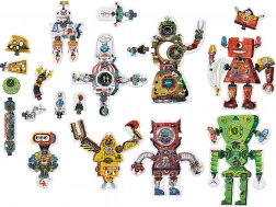 Otkrijte kreativnu slagalicu s motivom robota koja sadrži 63 čvrsta kartonska dijela, od toga 28 dvostranih. Dijelovi se mogu međusobno slobodno kombinirati, pa djeca mogu složiti do 8 velikih robota, a zatim njihov izgled i funkcije neograničeno mijenjati. Igra razvija finu motoriku, logičko razmišljanje, kreativnost i strpljenje – idealna zabava za predškolce zainteresirane za tehniku i izume.