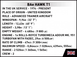 COBI Armed Forces BAe Hawk T1 je set koji vam omogućuje izradu modela zrakoplova koji je u službi britanskog Kraljevskog ratnog zrakoplovstva (RAF) od 1976. Ova je građevna igra idealna za sve ljubitelje zrakoplovnog modelarstva i vojne tehnologije. Model je dizajniran u mjerilu 1:48 i sadrži 362 elementa, koji zajedno čine krila raspona 19,5 cm. Model nudi otvarajući kokpit i odvojiva kola za efektno izlaganje na postolju.