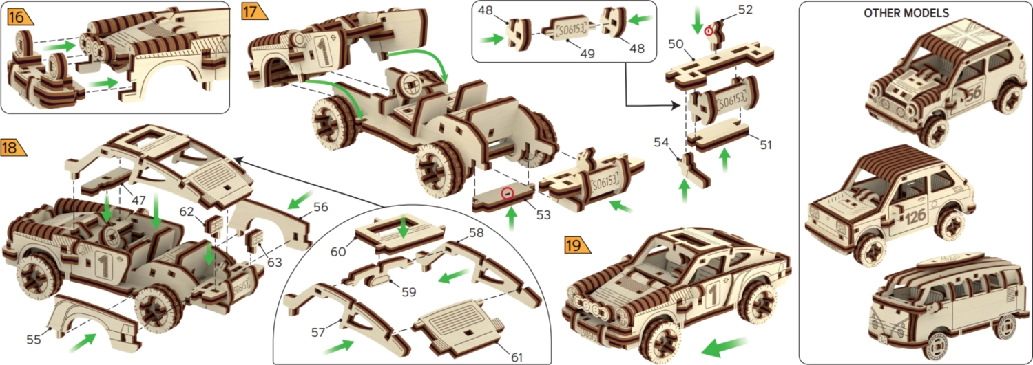 Precizno izrezani dijelovi od brezove šperploče savršeno se uklapaju, izrada traje oko 40 minuta i svatko je može savladati zahvaljujući laganoj razini težine. Model nadahnut svijetom motorsporta razveselit će djecu školskog uzrasta i odrasle entuzijaste.