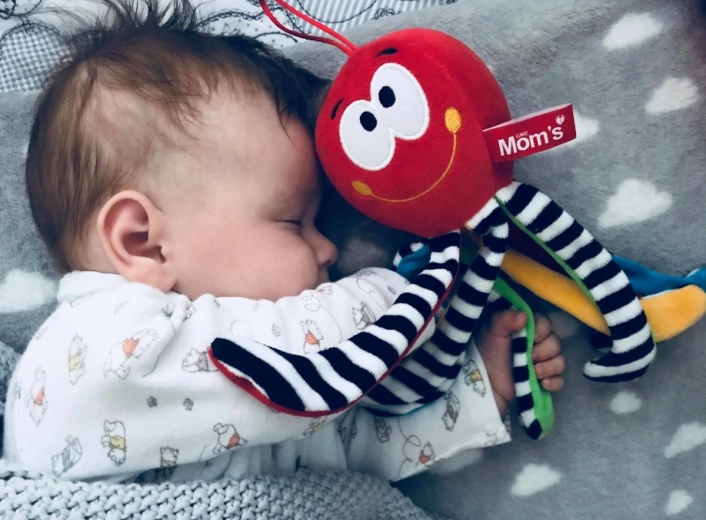 Za šivanje prvih plišanih igračaka vašeg djeteta koristimo sigurne tkanine s različitim teksturama. To omogućuje bebi upoznavanje svijeta i potiče osjet dodira. Ne zaboravljamo ni na pravilan razvoj vida. U samim počecima naše bebe ne percipiraju boje niti razlikuju oblike, stoga bismo trebali birati igračke koje su prije svega vizualni podražaji. Novorođenče ne percipira višebojne uzorke ni nasmiješena životinjice. Jednostavna kombinacija crne i bijele jedino je što novorođenče može percipirati. Crvena mini hobotnica dodatno ima ušivenu zvoncalicu čiji nježan zvuk pruža slušne podražaje i potiče dijete na daljnju igru. Zahvaljujući privjesku, kocka može putovati s djetetom pričvršćena na autosjedalicu, kolica ili torbu. Igračka je mekana, ima pahuljastu ispunu i ne predstavlja nikakvu opasnost za vaše dijete.