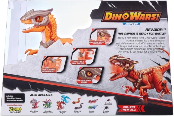 Ovaj Robo Alive Dino Wars Raptor od ZURU-a opremljen je s četiri uklonjiva obrambena oklopa koji se lako postavljaju i skidaju, što djeci omogućuje prilagoditi izgled dinosaura prema vlastitim zamislima. Igračka je namijenjena djeci od 3 godine naviše i izrađena je od kvalitetne plastike koja osigurava njezinu izdržljivost i dug vijek trajanja.