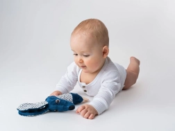 Zviždaljka i šušteće uške potiču sluh, kontrastni materijali treniraju vid, a raznolike teksture razvijaju osjet dodira. Šarene etikete motiviraju na hvat i vježbaju finu motoriku.
