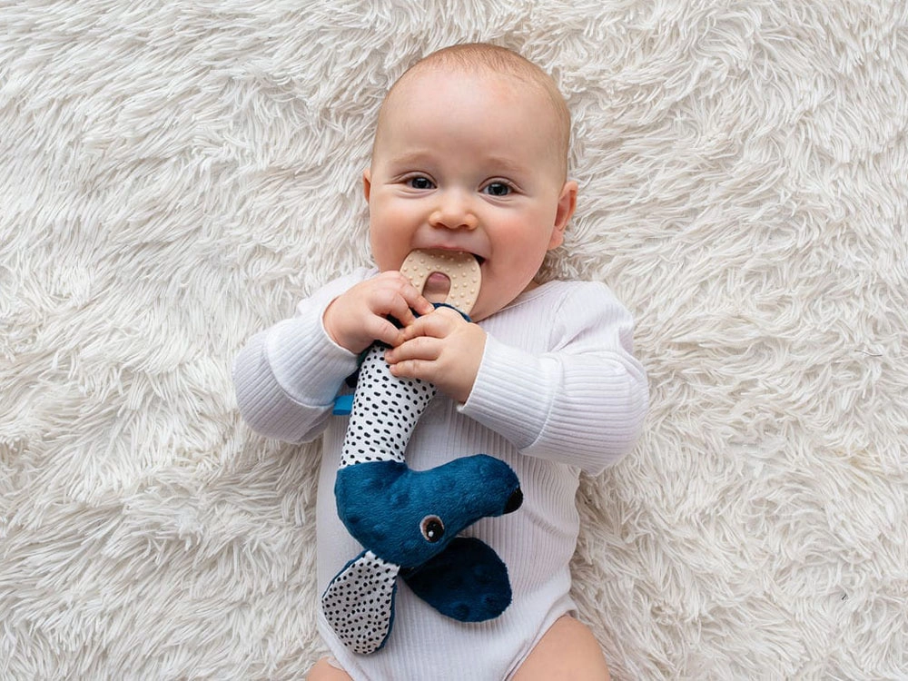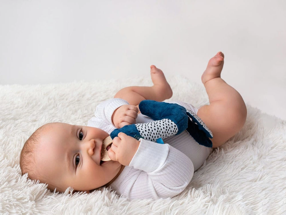 Meka, teksturirana silikonska grickalica masira desni i pomaže umiriti bebu u zahtjevnom razdoblju nicanja zubića. Lako se drži i sigurna je za prvo grickanje.