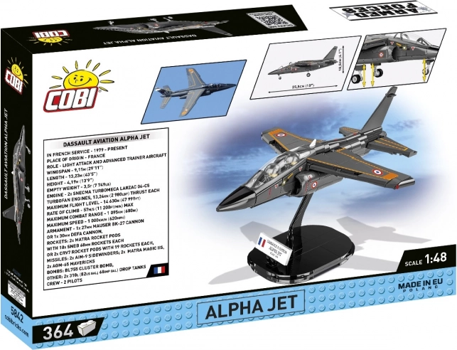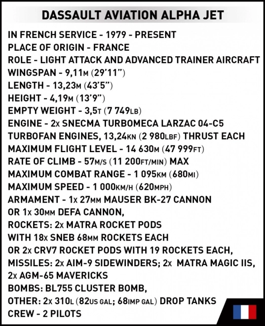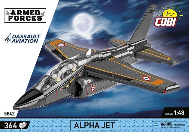 Alpha Jet je laki borbeni i napredni trenažni avion, nastao iz njemačko-francuske suradnje i ušao u službu u 70-im godinama 20. stoljeća. Ovaj model od kockica kreiran je pod licencom francuskog proizvođača vojnih aviona Dassault Aviation i nadopunjuje kolekciju modela Oružanih snaga u mjerilu 1:48.