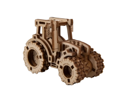 Laserom izrezani elementi od šperploče stvaraju realističan izgled traktora sa zupčanicima i gumama.