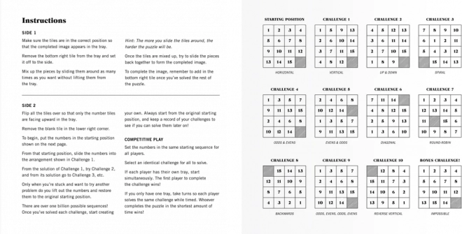 Ova igra nudi izazov i zabavu, jer što više pomičete pločice, razina težine raste. Dimenzije slagalice nakon sastavljanja su 15 x 15 cm, a s podložnom pločom 17,2 x 17,2 x 1,5 cm.