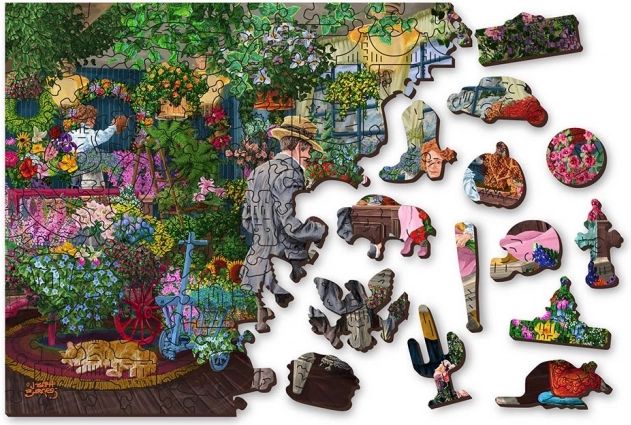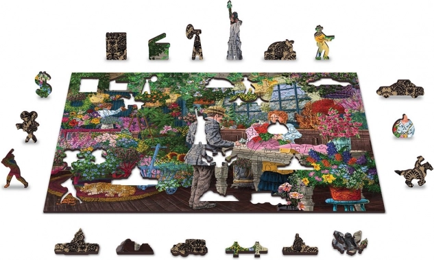 Stilske drvene puzzle s motivom žive cvjećarnice razveselit će ljubitelje detaljnih ilustracija i zahtjevnijih slagalica. Zahvaljujući obostranom izvedbom uživat ćete u dva slaganja u jednom – prednja strana s kolorističnom scenom punom cvijeća i poleđina s uzorkom za slaganje prema oblicima. Jedinstveni izrezi u obliku životinja, likova i predmeta djeluju kao male figurice i dodaju slaganju novu dimenziju.