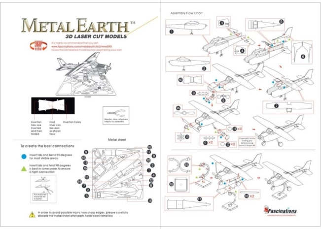 3D slagalica METAL EARTH predstavlja elegantan spoj tehničke preciznosti i kreativne zabave. Iz metalnih pločica dimenzija 11 × 11 cm izdvojite pojedine dijelove i pomoću zasuna ih spojite u realističan model CESSNA 172 SKYHAWK. Lasersko graviranje naglašava detalje i daje modelu autentičan izgled.