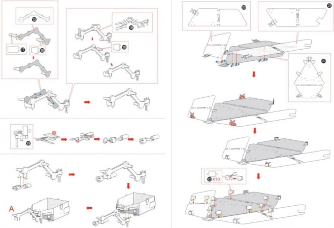 Za sastavljanje modela upotrijebite dijelove iz čeličnih pločica (11 x 11 cm) i slijedite priložene upute. Dijelove spajajte pomoću držača i otvora. Preporučujemo korištenje malih tankih kliješta, koja nisu dio pakiranja.
