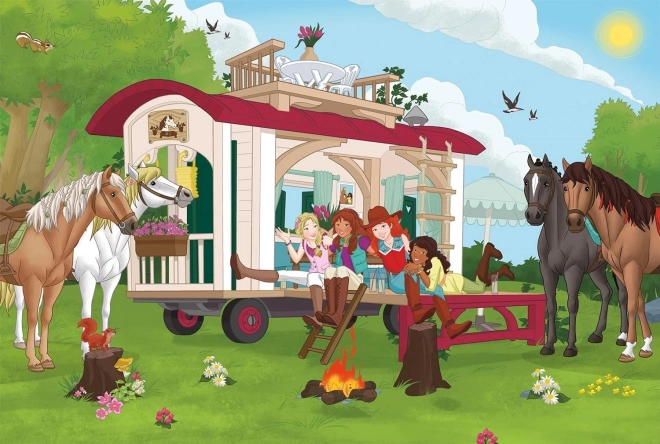 Puzzle SCHMIDT Schleich logorska vatra kod kamp-prikolice, 100 dijelova + figurica ždrijebeta. Kvalitetna zabava za djecu, dimenzije 36,1 × 24,3 cm. Sjajan poklon.