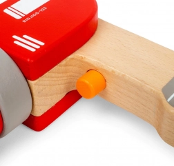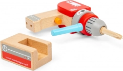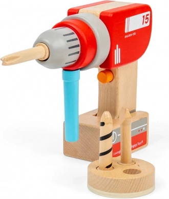 Ova drvena bušilica vjerno oponaša pravi alat, ali bez struje i oštrih dijelova. Djeca mogu ručno okretati glavu bušilice, prebacivati zamišljene režime pomoću klikajućeg gumba te lako postavljati magnetske nastavke i vijke. Idealna je za igre gradnje polica ili namještaja te razvoj praktičnih vještina.