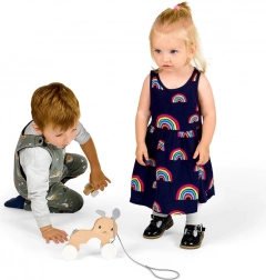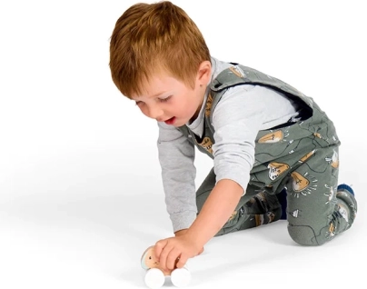 Četiri čvrsta kotačića s geometrijskim uzorkom glatko klize po ravnim površinama, dok se siva užad za povlačenje dobro drži i u malenim ručicama. Igračka pomaže razvijati spretnost, ravnotežu i koordinacijske vještine, te potiče aktivno kretanje i maštu.