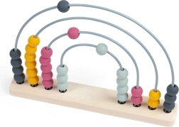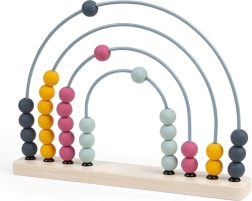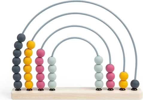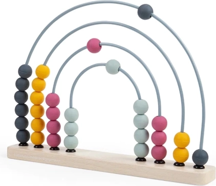 Postolje je izrađeno od FSC® certificiranog drva, lukovi su metalni, a kuglice od silikona kvalitete za prehranu. Zahvaljujući bezvremenskim pastelnim bojama i obliku duge, pristaje i kao dizajnerski dodatak. Nakon igre može krasiti policu i i dalje poticati otkrivanje brojeva.