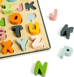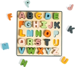 Drvena slagalica s 26 živopisnih slova savršeno je pomagalo za prvo upoznavanje s abecedom. Svako slovo ima svoj izrez u odgovarajućoj boji, što djeci olakšava pamćenje i pravilno sparivanje. Zahvaljujući čvrstim i lako prihvatljivim dijelovima djeca vježbaju koordinaciju ruka–oko i koncentraciju.