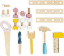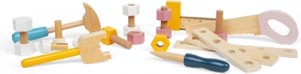 U kompletu su pila, ključ, čekić, odvijač, kutnik, matice i vijci – sve u pastelnim bojama i spremno za stvaranje.