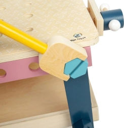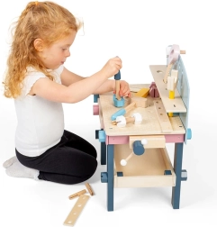 Stilski drveni radni stol za male majstore potiče finu motoriku, koordinaciju ruka–oko i kreativnu igru. U kompletu je bogat set alata – pila, ključ, čekić, odvijač, kutnik i mnoštvo matica i vijaka. Izrađeno od FSC certificiranog drva i obojeno netoksičnim bojama u nježnim neutralnim tonovima koji se odlično uklapaju u svaku dječju sobu.