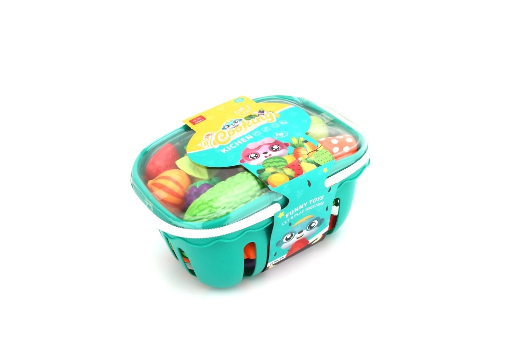 - Košara s poklopcem, voće i povrće za rezanje, ribica, tanjurići, daska za rezanje, nožići