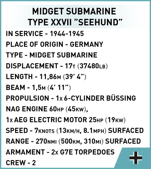Seehund (Tip XXVII B) bila je njemačka minijaturna podmornica iz 1944. s dvočlanom posadom, korištena pri kraju Drugog svjetskog rata. Ovaj licencirani kolekcionarski set nastao je u suradnji s Deutsches Marinemuseum, gdje je izložen jedan od rijetko sačuvanih primjeraka. COBI set vjerno dočarava karakteristične linije originala u optimiziranom mjerilu 1:72.