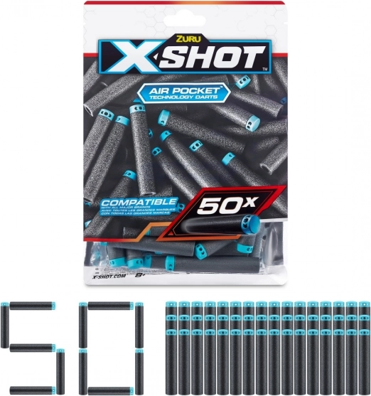 S ovim praktičnim setom za nadopunu od 50 strijela više nikada nećeš propustiti nijednu priliku! X-Shot strijele s Air Pocket tehnologijom dizajnirane su za daljnje, brže i preciznije pucanje. X-Shot strijele kompatibilne su s većinom vodećih marki i nude vrhunske performanse zahvaljujući nevjerojatnoj tehnologiji lagane pjene! Isporučuje se s zatvorivom kutijom za jednostavno spremanje nakon bitke.