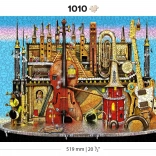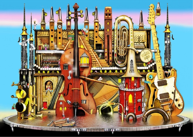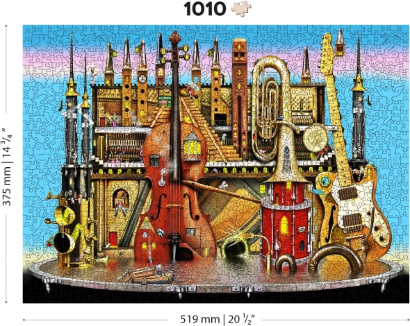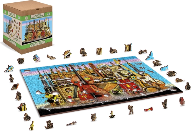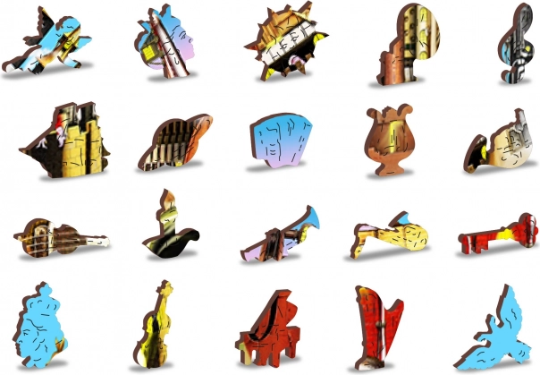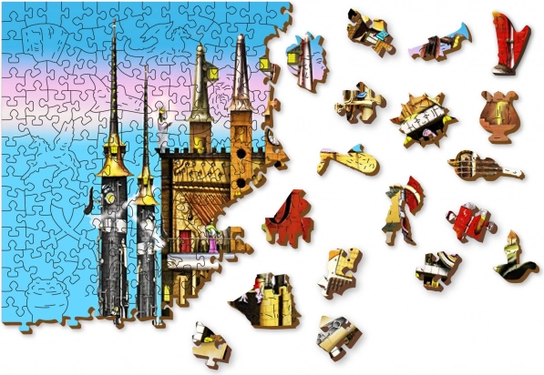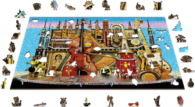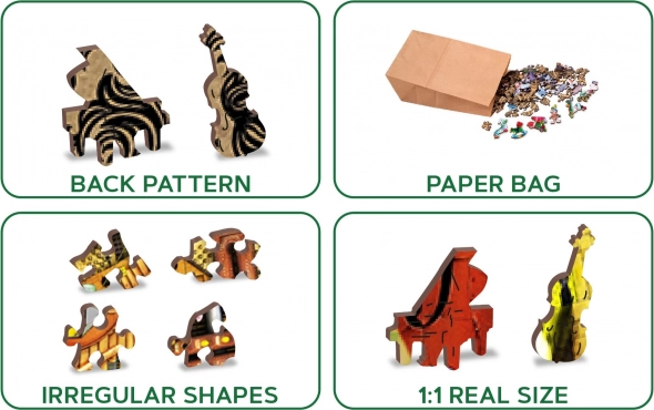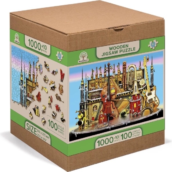 Ove premium drvene puzzle donose originalan motiv glazbenog grada s instrumentima i tornjevima koji će oduševiti odrasle i znatiželjnu djecu. Dijelovi su laserski izrezani iz čvrste HDF ploče (3–4 mm), imaju glatke rubove bez iverja, a dio njih čine posebni oblici životinja, građevina i predmeta. Zahvaljujući njima slaganje je zahtjevnije, ali istodobno iznimno zabavno i vizualno dojmljivo.
