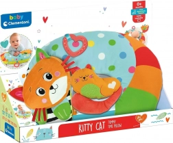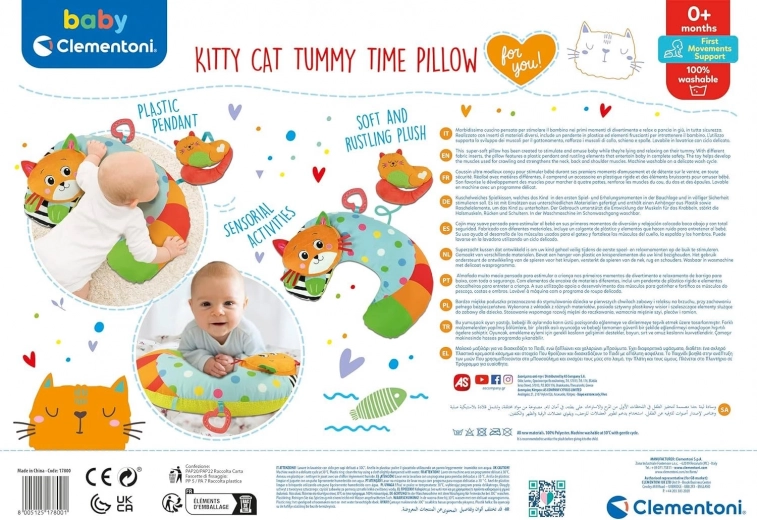 Raznolike teksture presvlake stimuliraju dodir, šuškavo mače i mačji brkovi potiču znatiželju i koordinaciju, dok plastično srce na trakici služi kao praktična grickalica tijekom nicanja zubića. Jastučić je jednostavan za održavanje – može se prati na nježnom programu.
