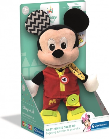 Slatki plišani Baby MICKEY donosi djeci nježan zagrljaj i pametnu zabavu. Zahvaljujući Montessori elementima – patentnom zatvaraču, velikom gumbu, povičici s rupicom i čičak trakom – potiče finu motoriku, osjetilno opažanje i samostalno istraživanje.