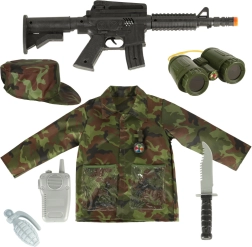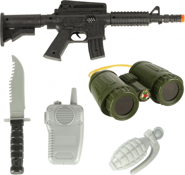 Set sadrži plastične dodatke kao što su oružje, nož, radio i ostalo, za realistično igranje i razvoj mašte.