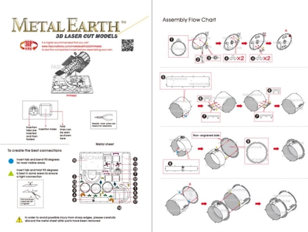 Model se sklapa bez ljepila – dijelovi se povezuju pomoću sitnih zasuna i savijenih jezičaka. Preporučeno za dob 14+. Gotov model ima kompaktne dimenzije oko 7,5 × 6 × 5 cm, pa će se odlično uklopiti na svaki radni stol.