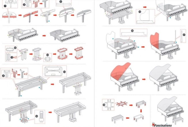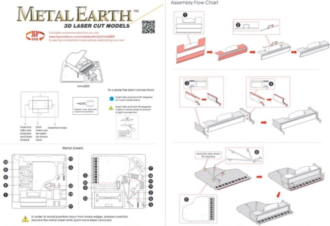 Gotovi klavir veličine približno 7,5 × 6,8 × 5,9 cm postat će upečatljiva dekoracija kod kuće, u uredu ili u školskoj vitrini. Pakiranje sadrži 2 čelična lista i ilustrirani priručnik; za montažu preporučujemo male bočne rezače i fine ravne kliješta (nisu uključeni).