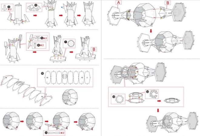 Dijelovi se spajaju pomoću jezičaka i otvora. Dovoljne su male kliještice i strpljenje – rezultat je čvrst i čist, bez ljepila.