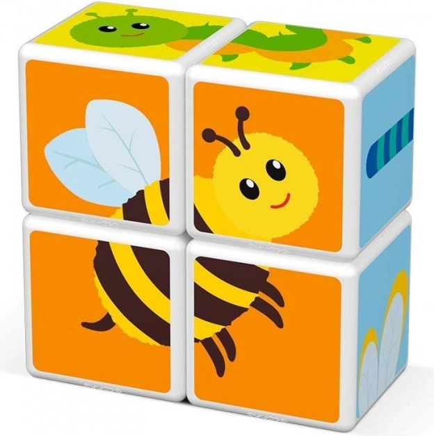 Zahvaljujući magnetima na svih šest strana kocki, slaganje je intuitivno i uspješno čak i za najmlađe. Igra prirodno razvija vještine u duhu STEM – potiče znatiželju, logiku i razumijevanje odnosa u prostoru. U pakiranju se nalaze i 3 dvostrane karte sa slikama za lako slaganje.