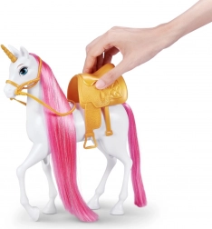 Bijeli jednorog sa zlatnim sedlom te ružičastom grivom i repom poziva na češljanje i stiliziranje – idealno za razvoj kreativnosti.
