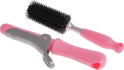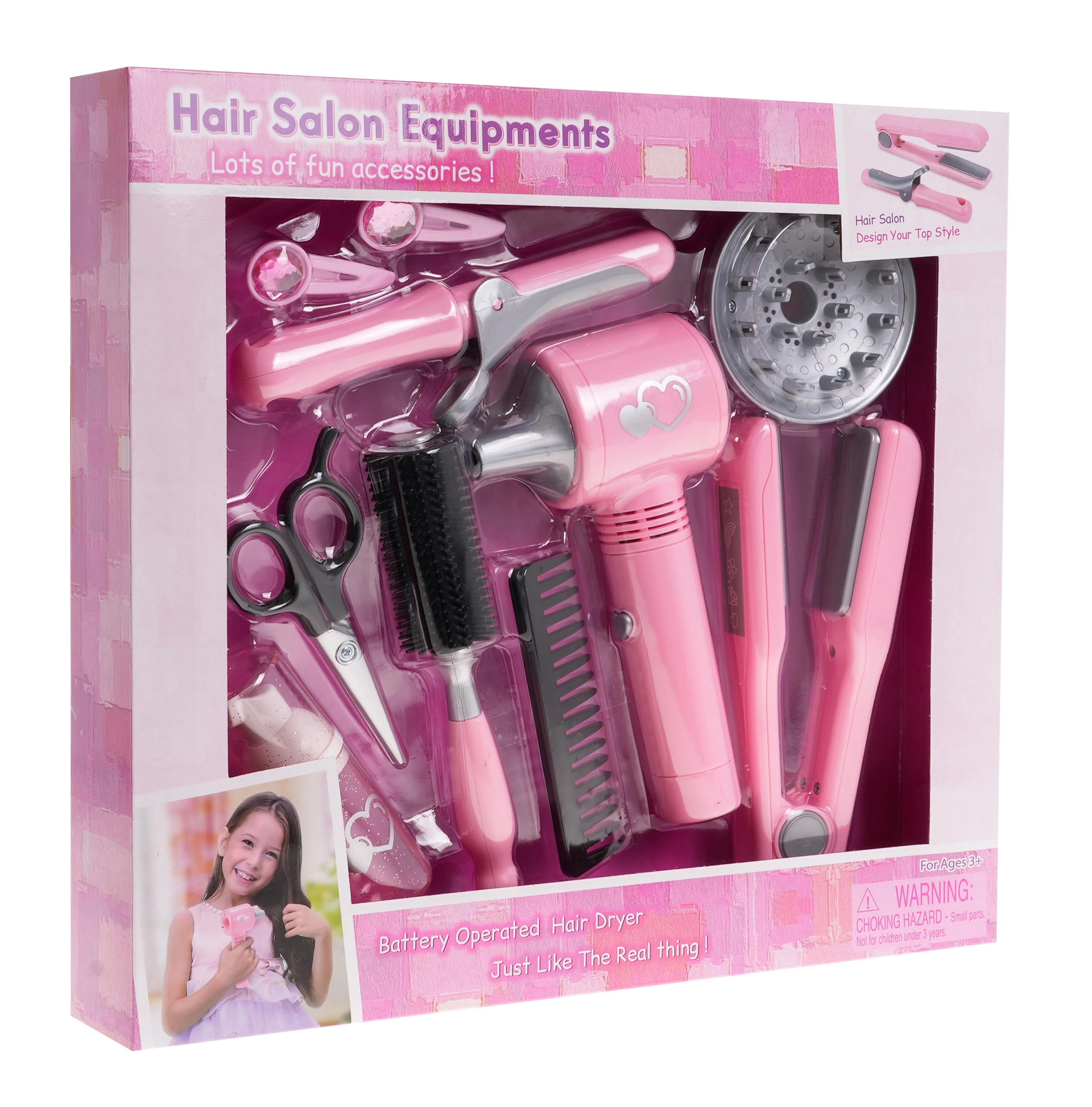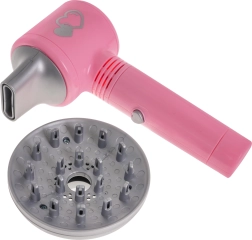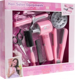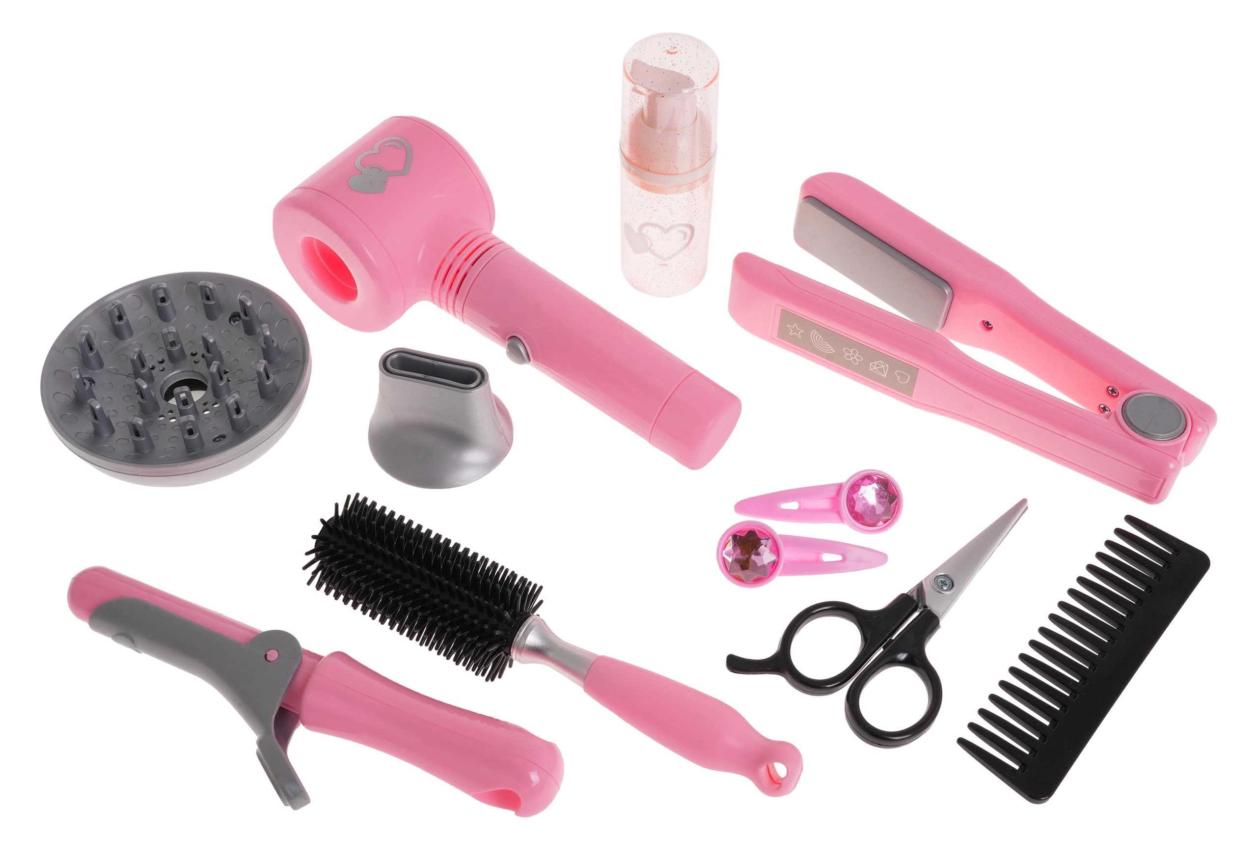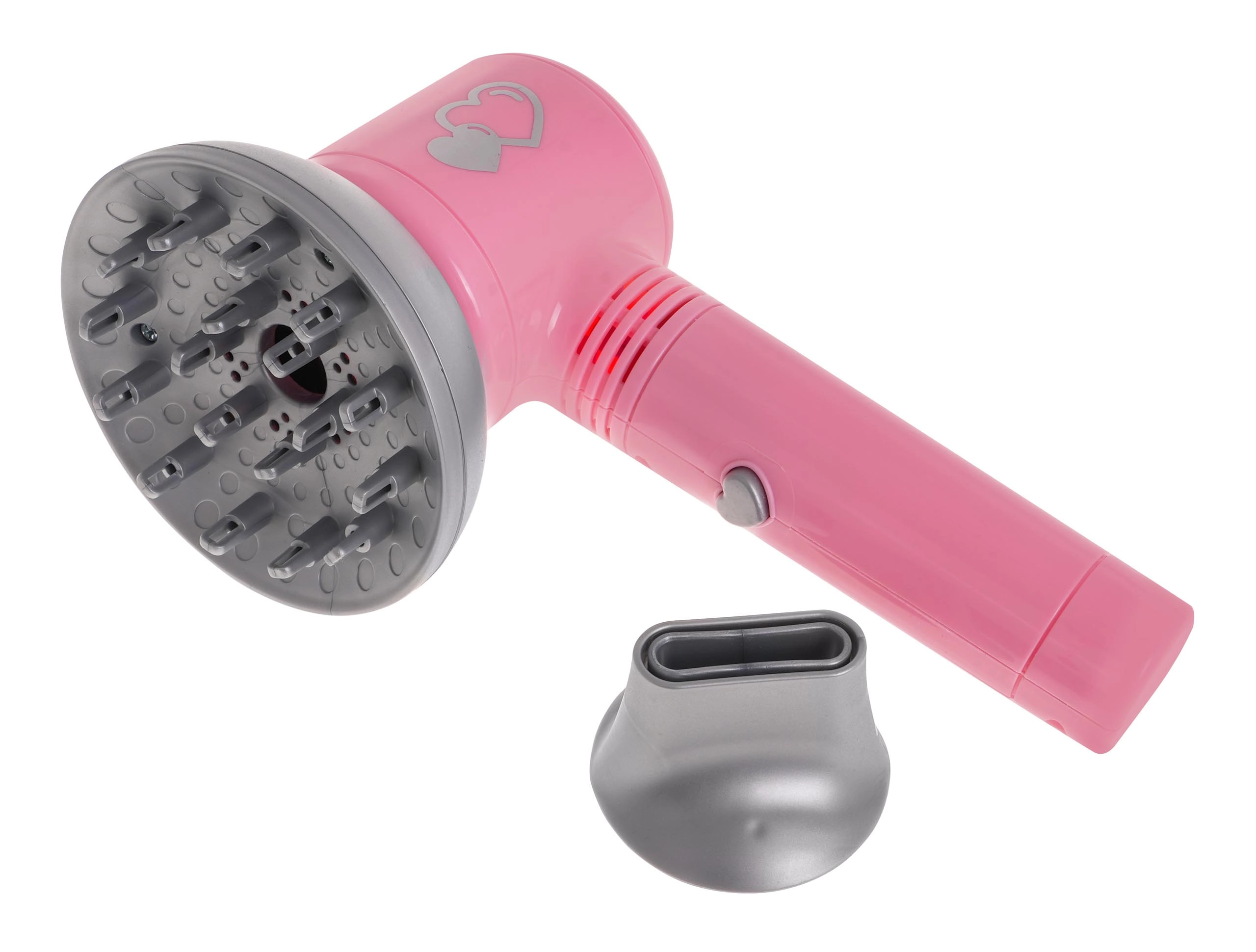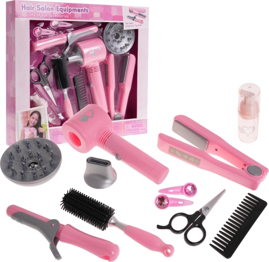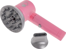 Dječji set frizerskih alata uključuje sve što je potrebno maloj frizerki za njezine prve pokušaje stiliziranja kose. Sušilo je napajano baterijama i nudi lagani protok zraka koji vjerno simulira stvarno sušenje kose. Dostupan je s dva izmjenjiva nastavka - difuzorom i koncentratorom.