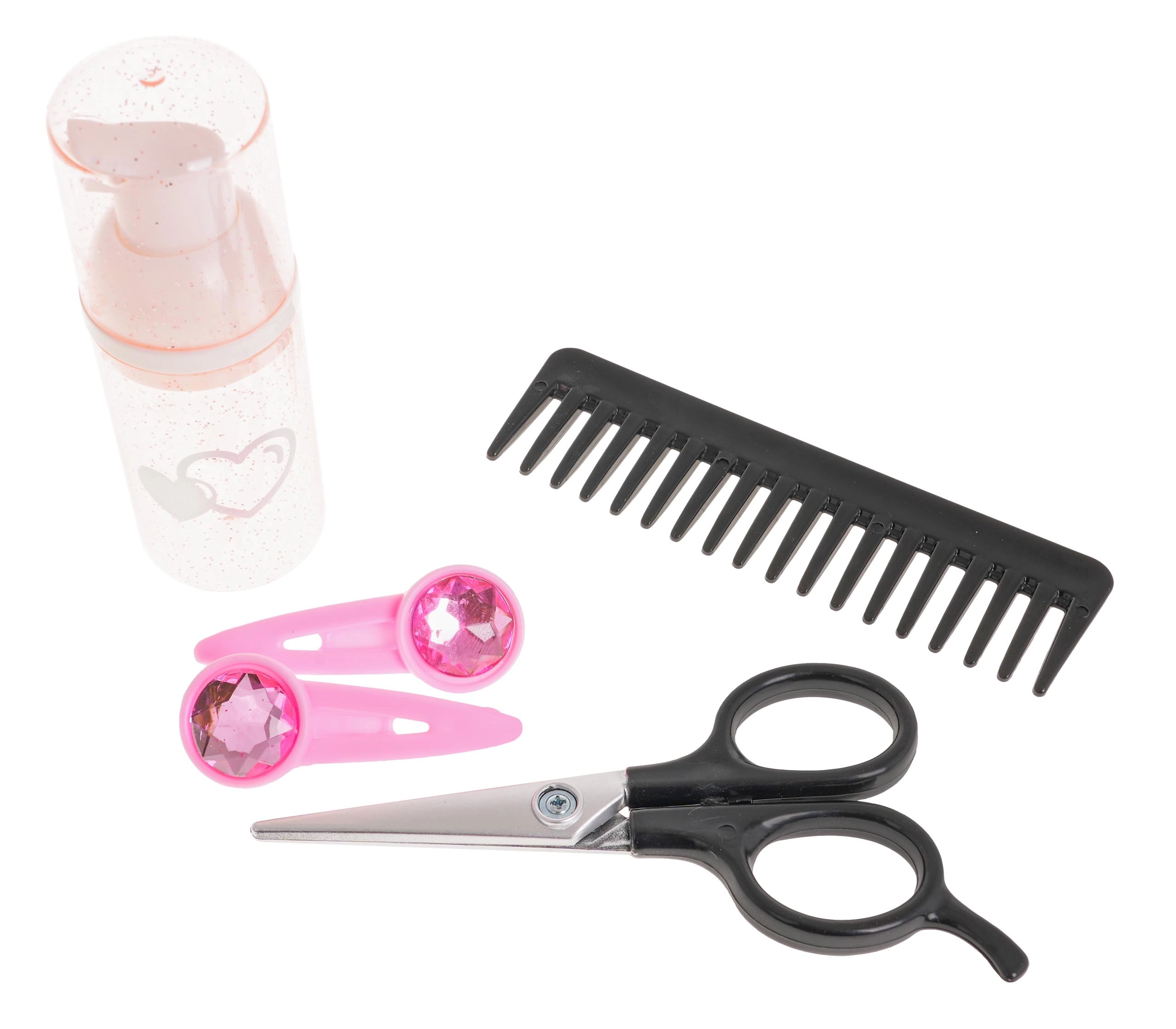 Set također uključuje figaro i peglu za kosu, češalj, četku, škare, bočicu i špangice, što omogućava sve potrebno za kreativno igranje.