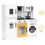 Ova stilska dječja kuhinjica u bijelo-drvenom dizajnu vjerno oponaša pravu kuhinju. Zahvaljujući svjetlećim pločama i zvukovima kuhanja nakon pritiska crvenih tipki, igra je još privlačnija. Vrata koja se otvaraju na hladnjaku, pećnici, mikrovalnoj i perilici, okretni gumbi štednjaka i “dispenzer vode” s klokotajućim zvukom potiču realistične scenarije igre.