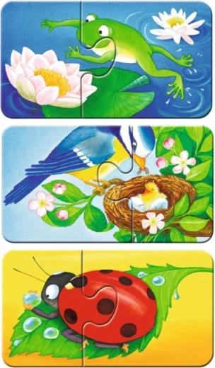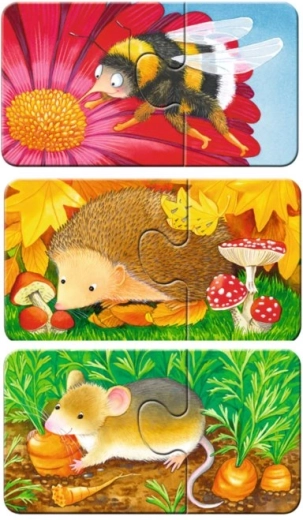Dvodijelne puzzle s prekrasnim slikama posebno stvorenima za najmlađu djecu. Robusni, čvrsti dijelovi izrađeni su od ekstra debelog kartona i potiču kod djece razvoj motorike, koncentracije i mašte. Među devet slika pronaći ćete omiljene životinje koje možete susresti u vrtu i njegovoj okolici: leptir, jež, bubamara i druge. Dimenzije složene puzzle približno 18 x 10 cm