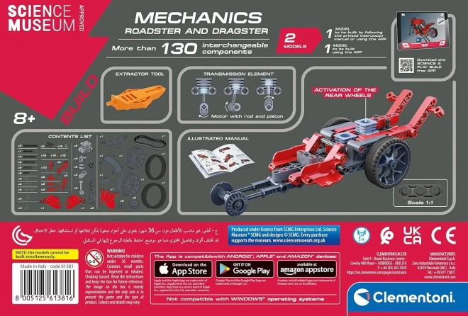 Ovaj set iz linije CLEMENTONI SCIENCE & PLAY uvodi djecu u svijet mehanike i inženjerstva. Sastavite okretni roadster ili snažni dragster i upoznajte kako funkcioniraju zupčanici, klipnjače, klipovi i prijenosni moduli. Zahvaljujući preciznom spajanju dijelova uživat ćete u robusnoj konstrukciji i glatkom kretanju modela.