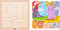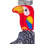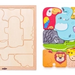 Ova drvena slagalica s egzotičnim životinjama savršena je prva puzzle za najmlađe. Veliki, šareni dijelovi lako se drže i pomažu djeci vježbati finu motoriku, koordinaciju i logičko razmišljanje. Svaki dio ima jasne boje i prijateljski dizajn koji potiču vizualnu percepciju i prepoznavanje oblika.