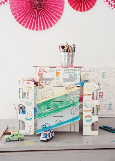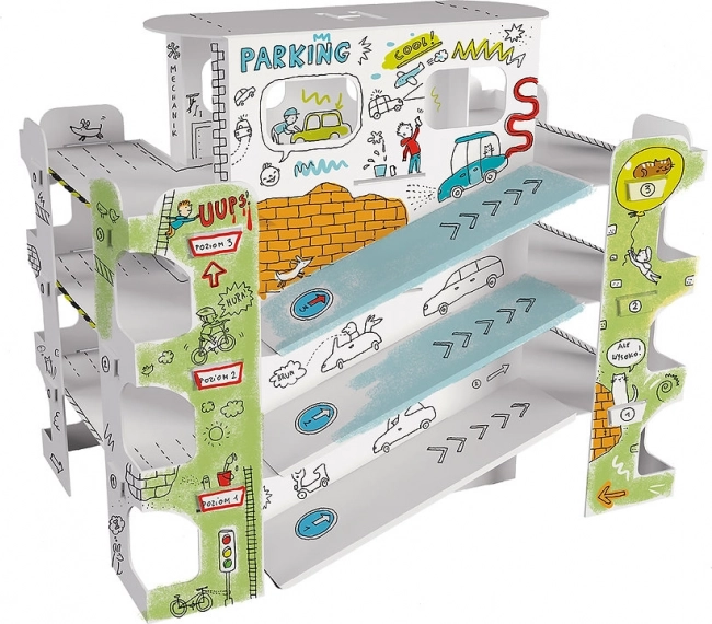 Otkrijte kreativnu igračku koja spaja 3D bojanku i višekatno parkiralište za autiće. Izdržljiva tektura s bijelim kartonom, jednostavno sastavljanje bez ljepila i škara, pokretni elementi i otvoreni prostori jamče sate zabave te razvoj fine motorike i mašte.