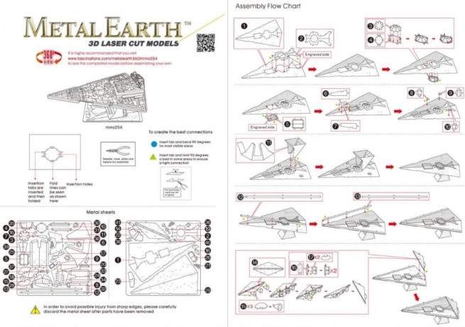 Pojedine dijelove izvadite iz metalnih pločica; po potrebi upotrijebite male grickalice/rezače (nisu uključeni). Dijelovi se spajaju pomoću zasuna koji se sastoje od jezička (kukice) i otvora. Jezičak savijte pomoću malih tankih kliješta (nisu uključena) i postupno spojite sve zasune dok ne nastane vrlo realistično remek-djelo!