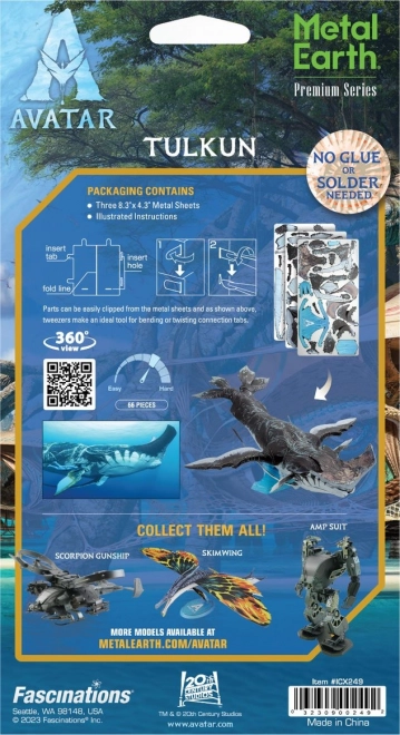 Otkrijte čaroliju svijeta AVATAR uz metalni 3D model METAL EARTH Premium Series: Tulkun. Sastavite detaljnu repliku kultnog morskog stvora od laserski graviranih čeličnih pločica. Model je idealan za ljubitelje filmova, tehničkih slagalica i dizajnerskih dekoracija. Realistični detalji, impresivan izgled i zabavan izazov za spretne ruke.