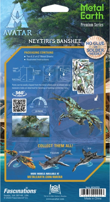 Premium serija METAL EARTH donosi službeno licencirani model Neytirijinog Bansheea iz filma AVATAR. Iz ravnih čeličnih pločica uz pomoć pametnih zasuna nastaje trodimenzionalna minijatura s bogatim detaljima i izražajnom površinom zahvaljujući finom laserskom graviranju. Idealno kao kolekcionarski model, dizajnerska dekoracija i poklon za ljubitelje filma.
